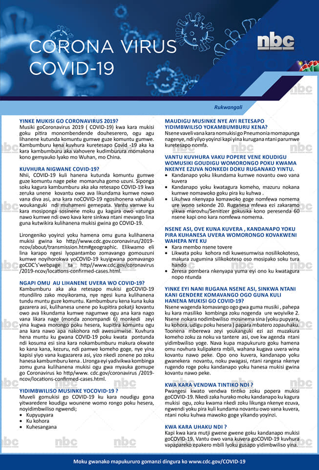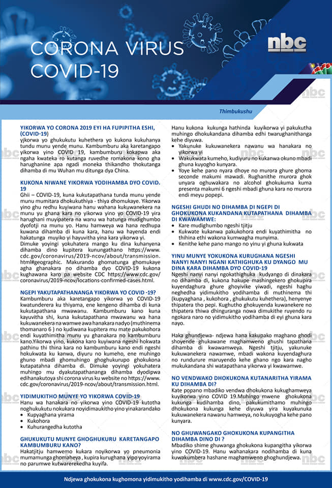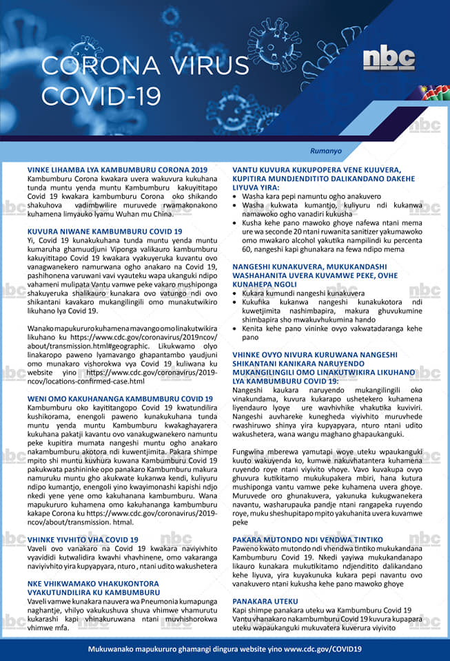 Corona Virus, COVID-19: Pamphlet from NBC in Rukwangali