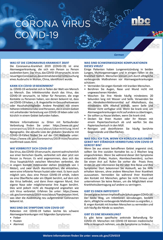 Corona Virus, COVID-19: Pamphlet from NBC in German