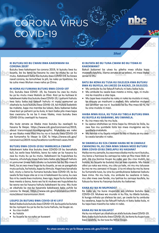 Corona Virus, COVID-19: Pamphlet from NBC in Silozi