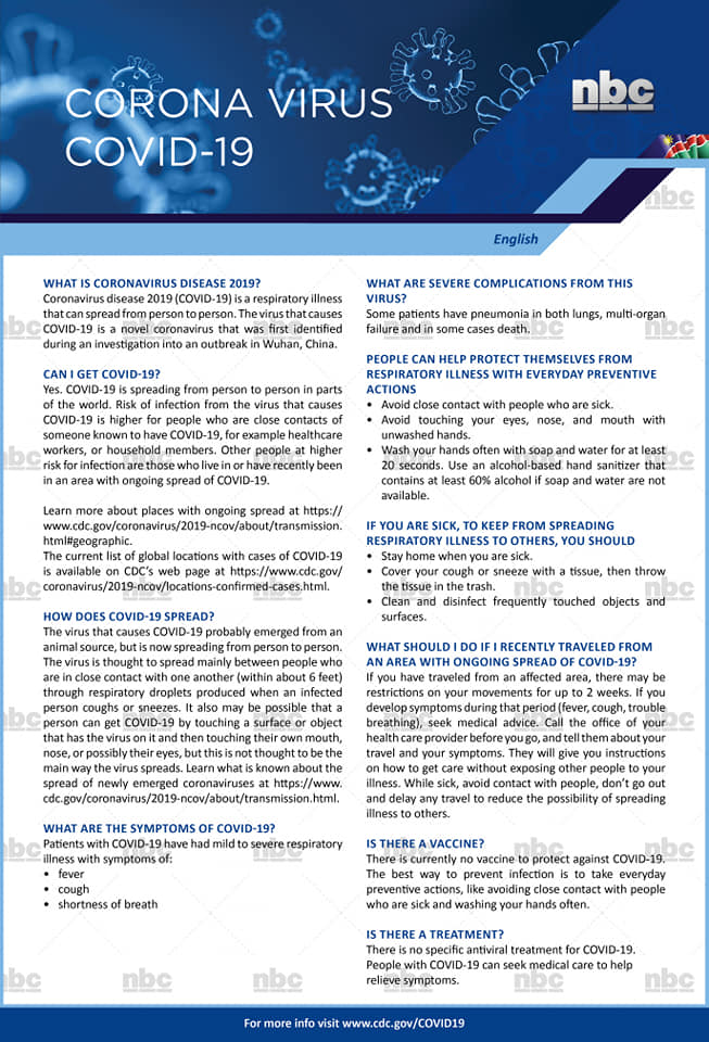 Corona Virus, COVID-19: Pamphlet from NBC in English