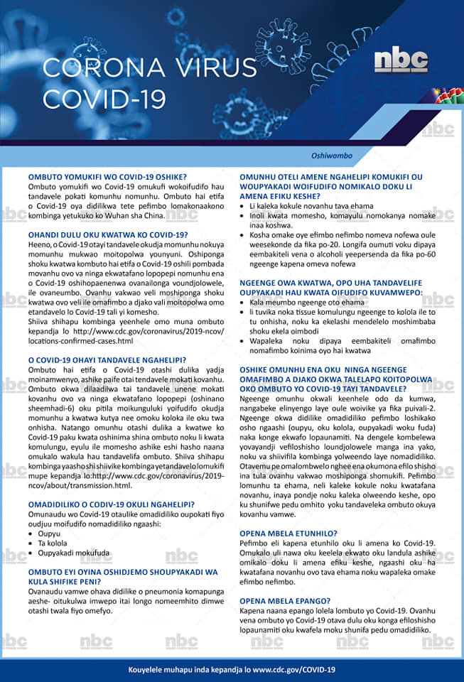 Corona Virus, COVID-19: Pamphlet from NBC in Oshivambo