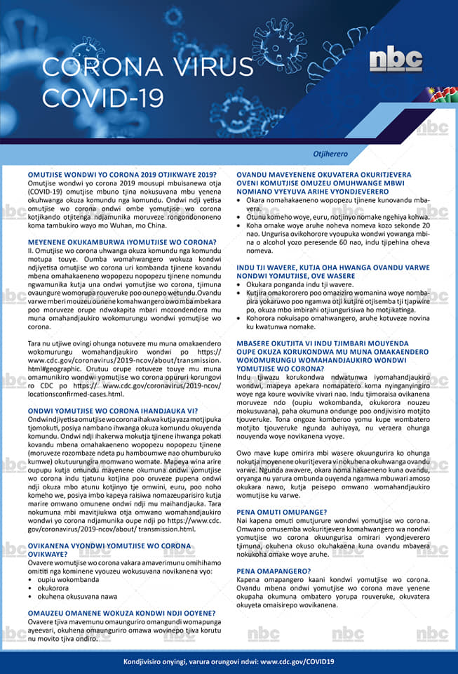 Corona Virus, COVID-19: Pamphlet from NBC in Otjiherero