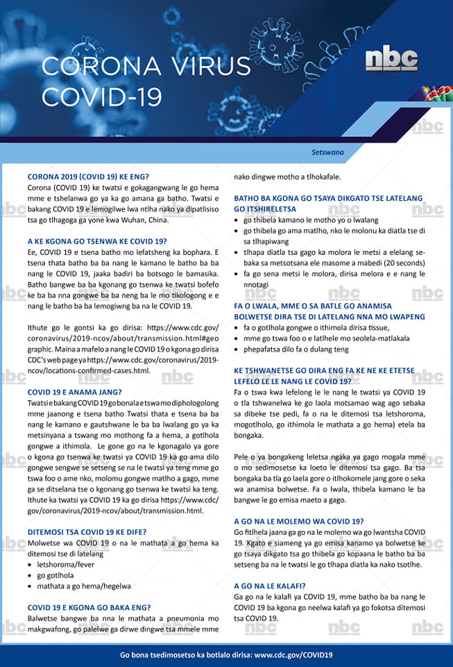 Corona Virus, COVID-19: Pamphlet from NBC in Setswana