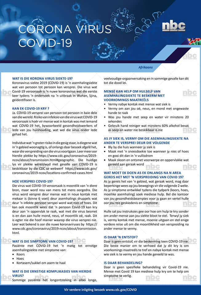 Corona Virus, COVID-19: Pamphlet from NBC in Afrikaans