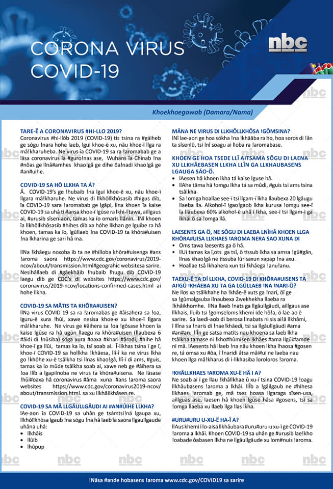 Corona Virus, COVID-19: Pamphlet from NBC in Khoekhoegowab