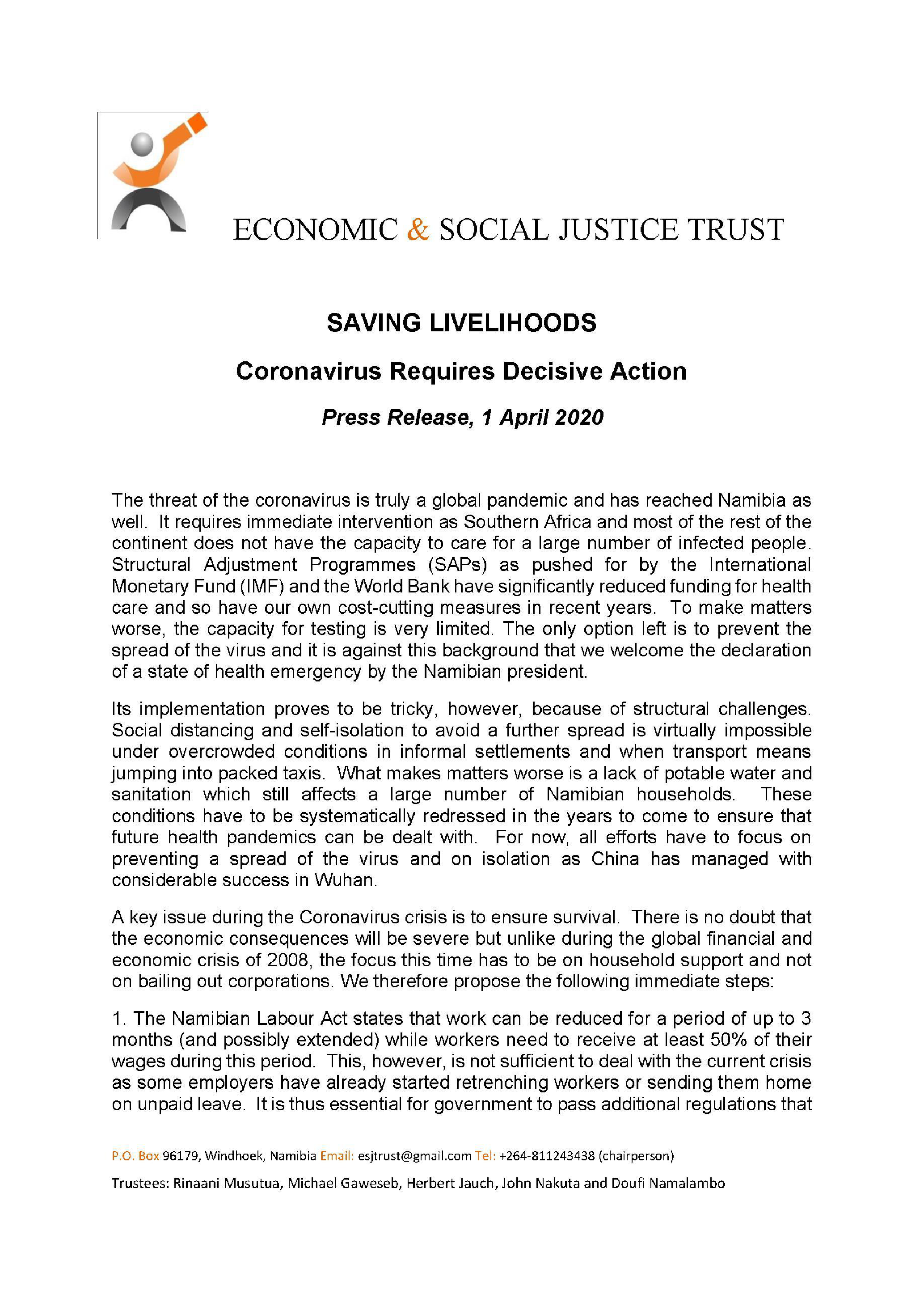 P.O. Box 96179, Windhoek, Namibia Email: esjtrust@gmail.com Tel: +264-811243438 (chairperson)