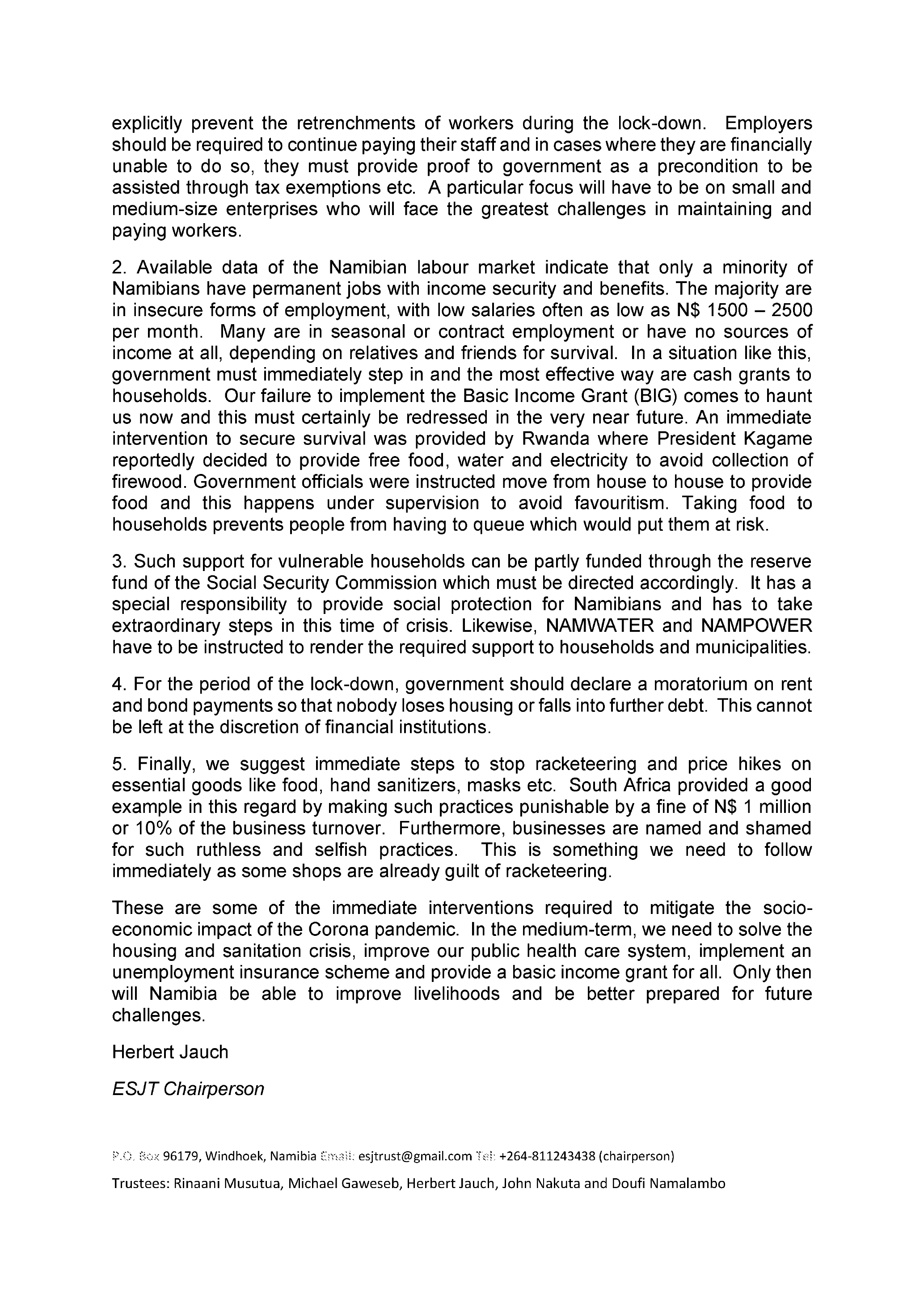 8.0, Sox 96179, Windhoek, Namibia £:at: esjtrust@gmail.com ‘s!: +264-811243438 (chairperson)