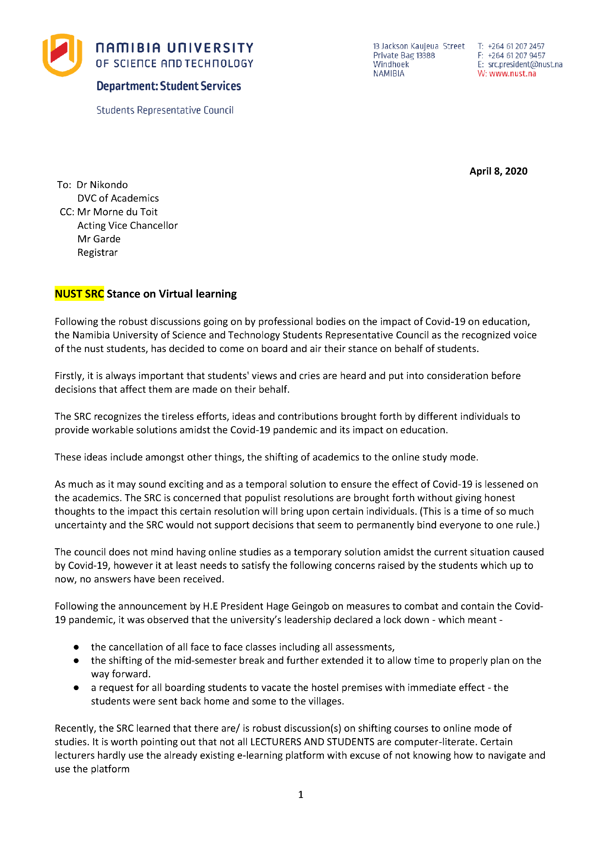 the Namibia University of Science and Technology Students Representative Council as the recognized voice