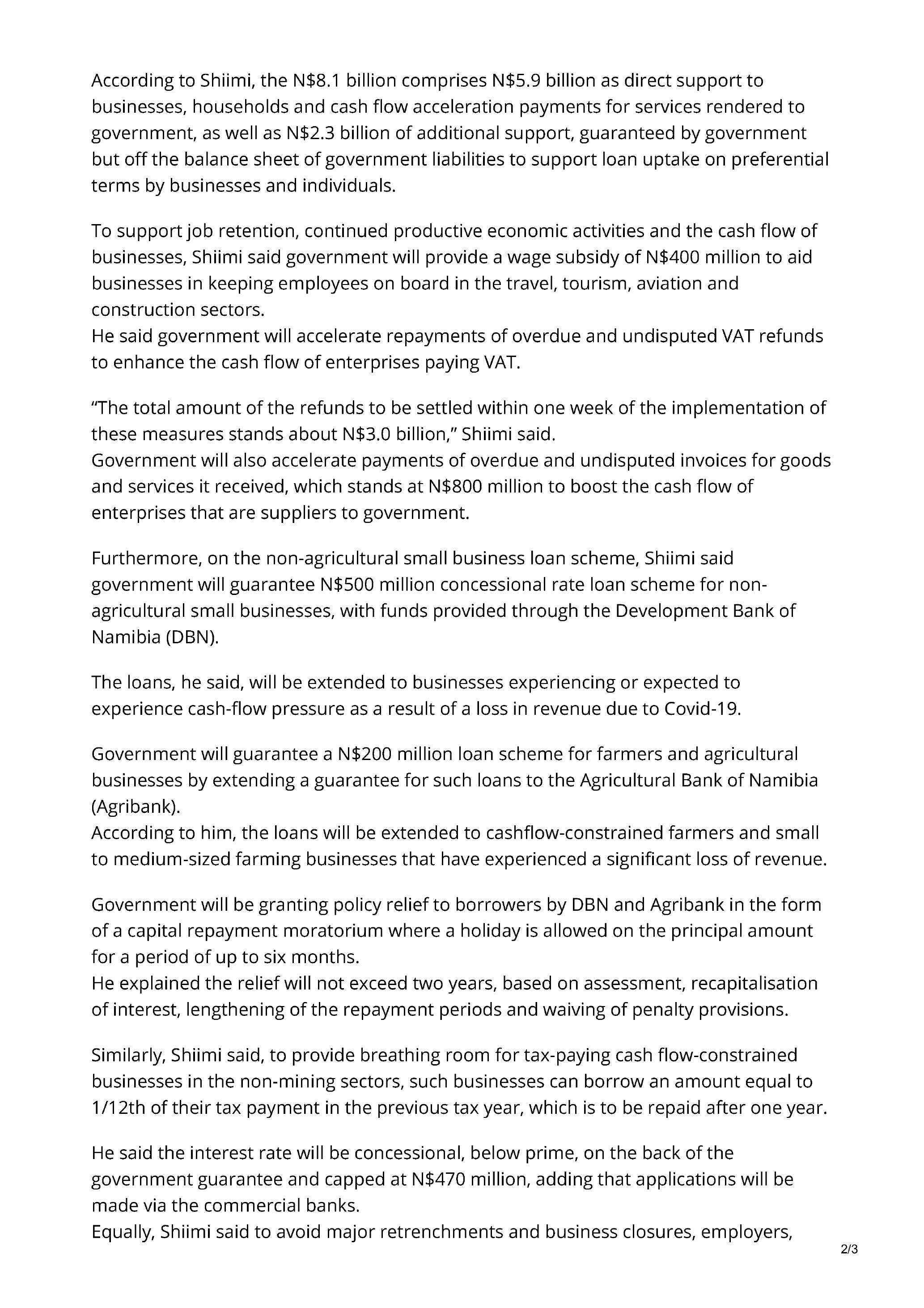 government, as well as N$2.3 billion of additional support, guaranteed by government