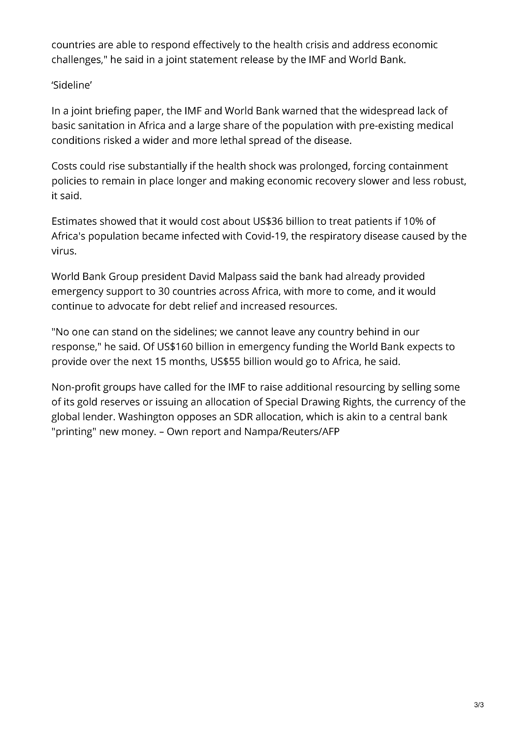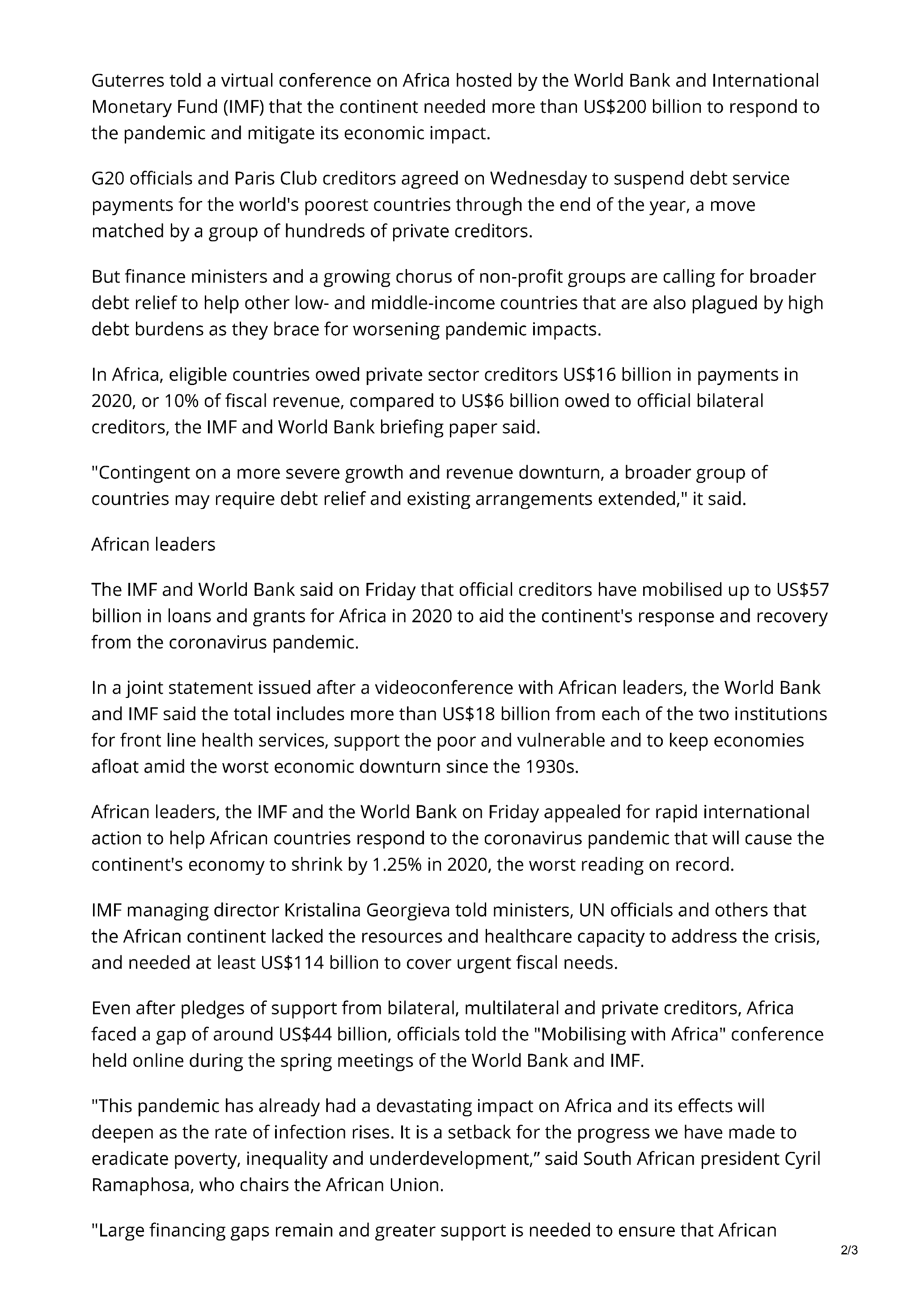 Monetary Fund (IMF) that the continent needed more than US$200 billion to respond to