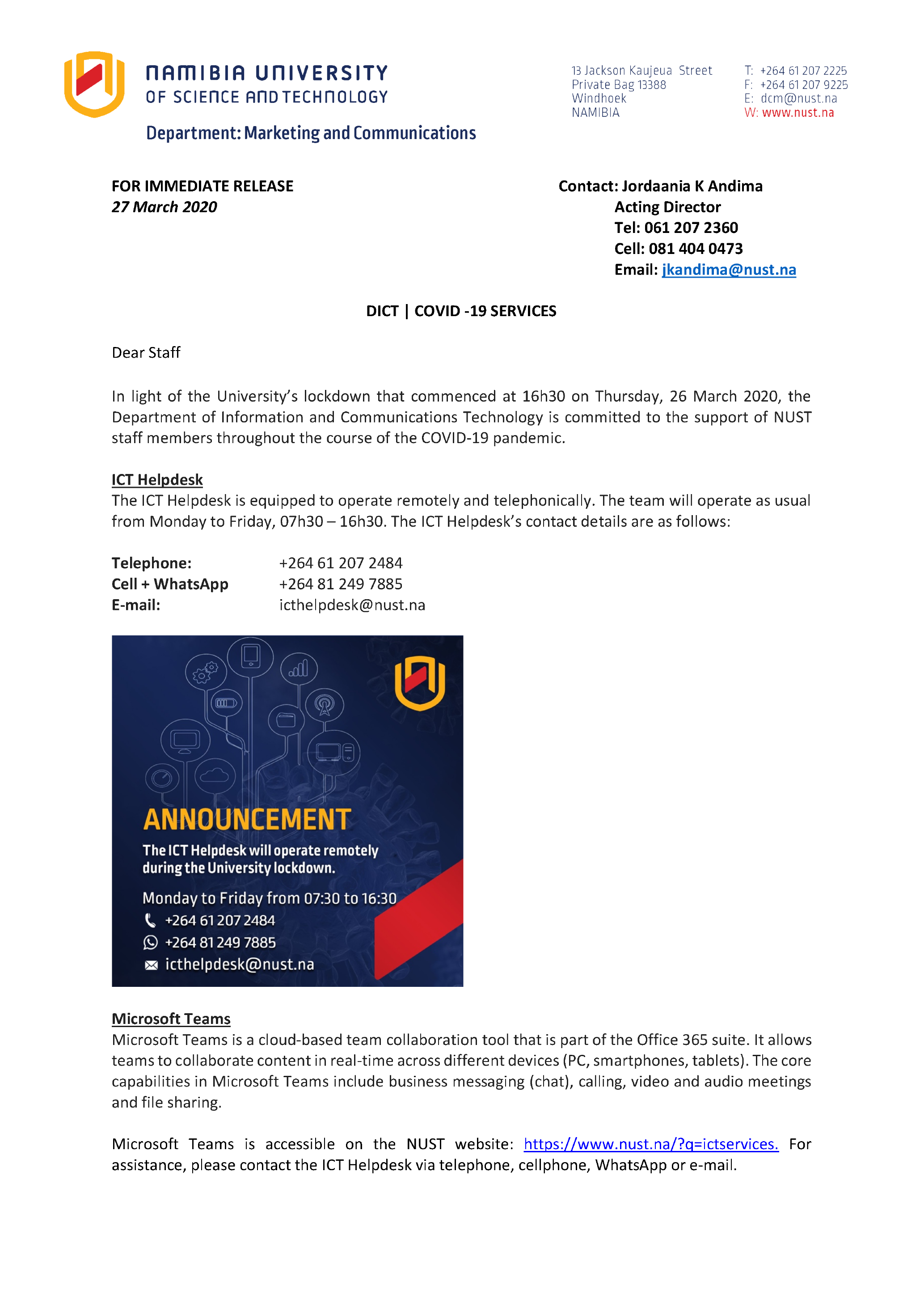 https://www.nust.na/?q=ictservices. For assistance, please contact the ICT Helpdesk via telephone,
