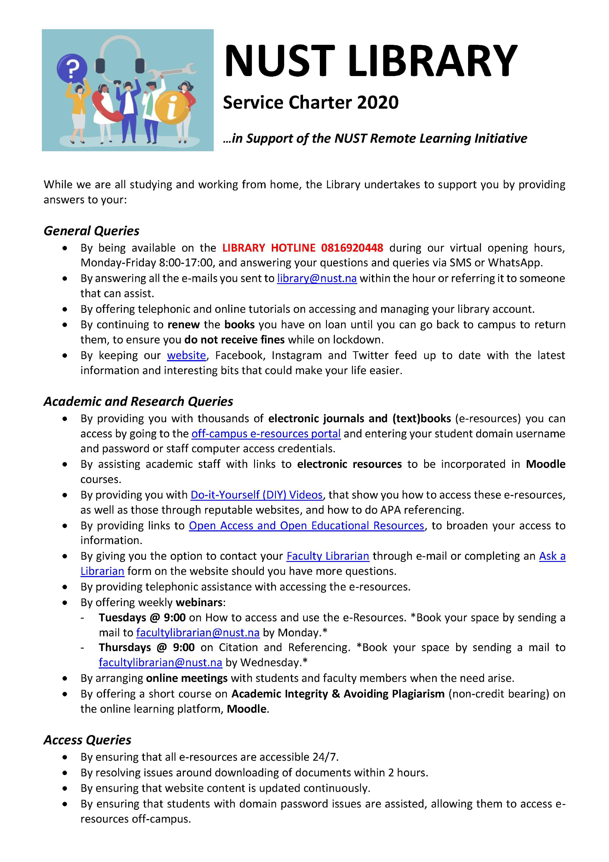 By being available on the LIBRARY HOTLINE 0816920448 during our virtual opening hours,