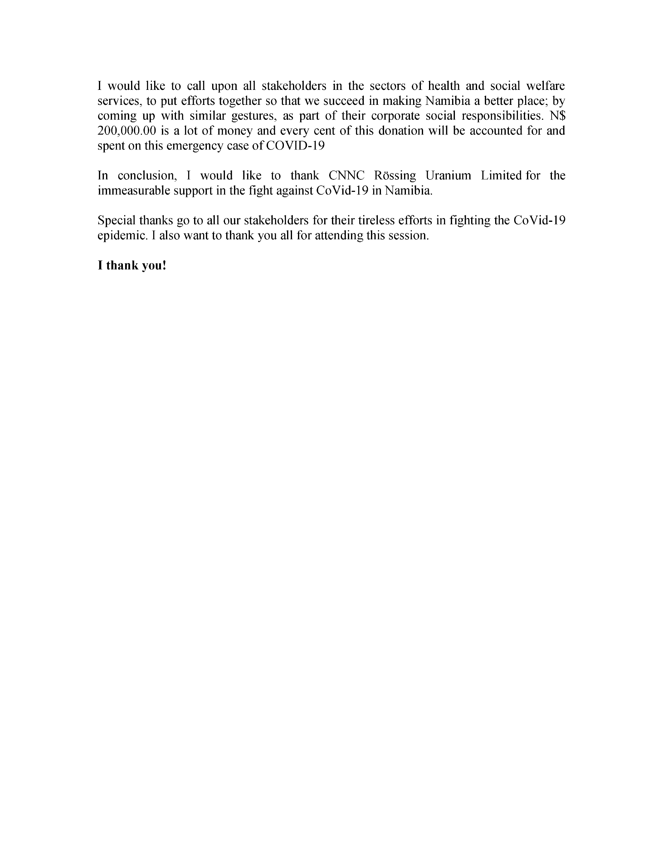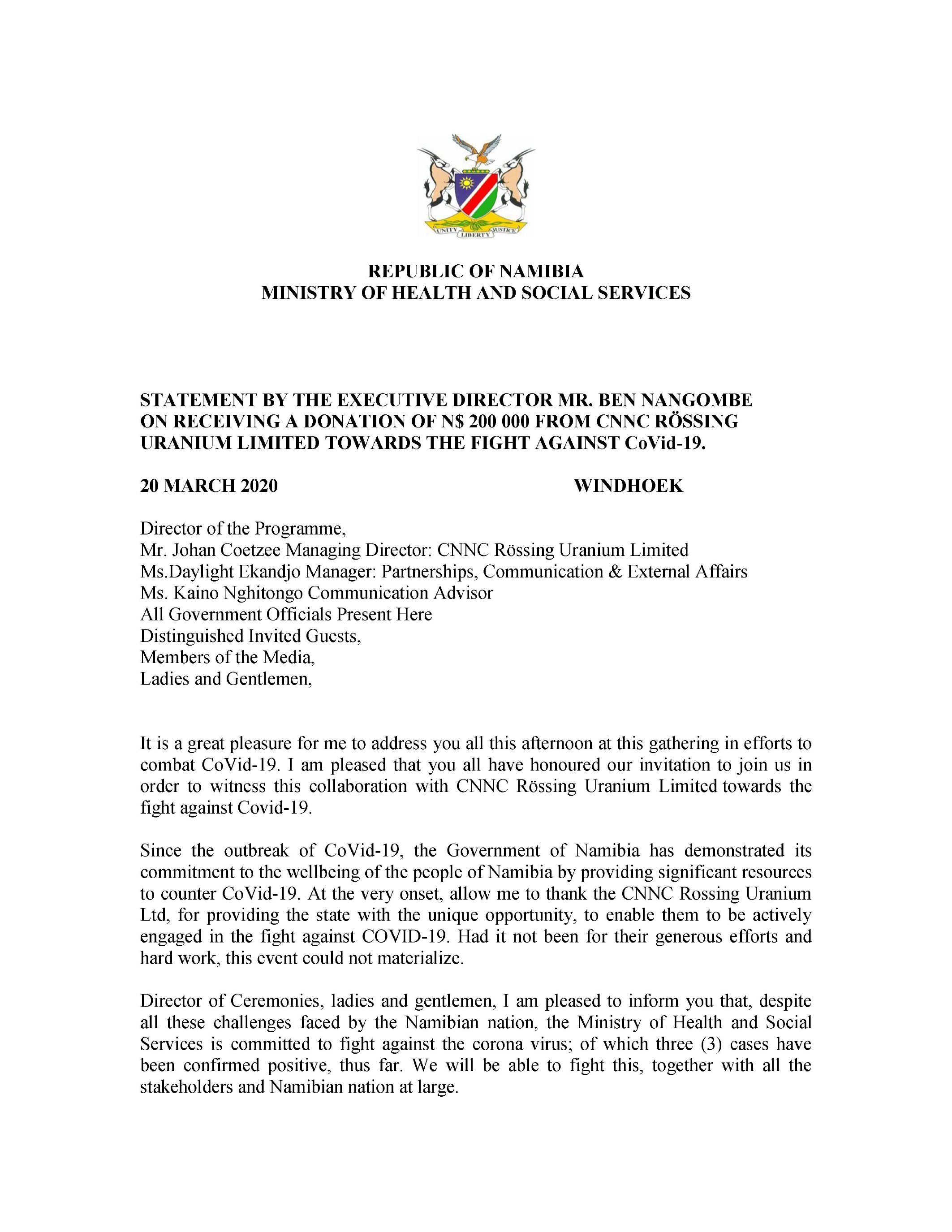 to counter CoVid-19. At the very onset, allow me to thank the CNNC Rossing Uranium