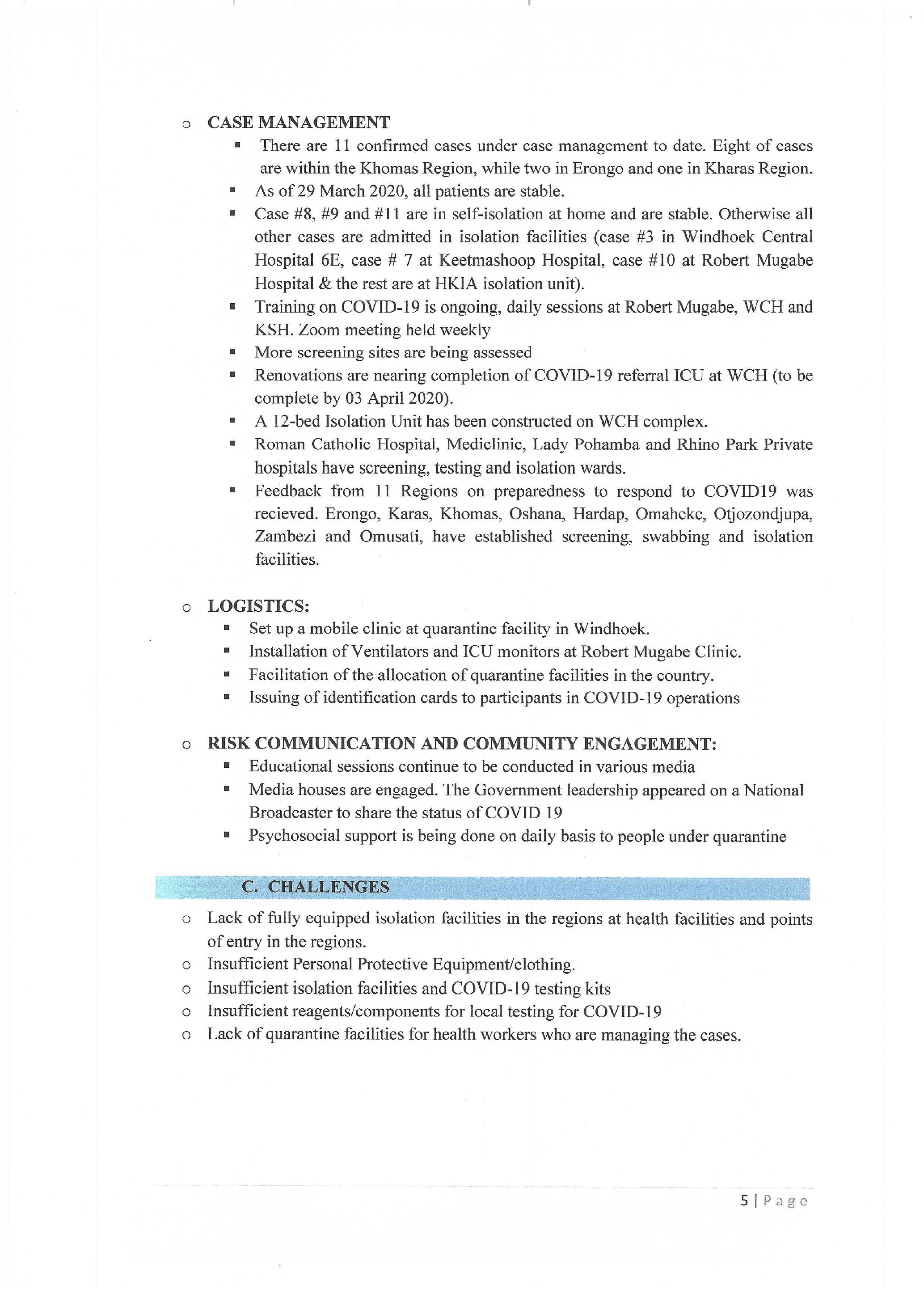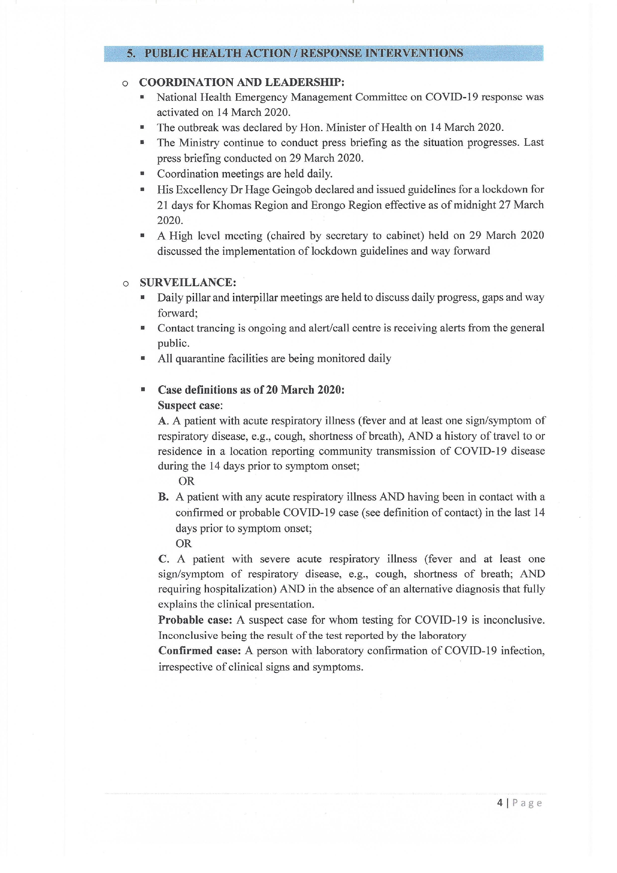 e Supervised quarantine for all Namibians for 14 days from affected countries is ongoing