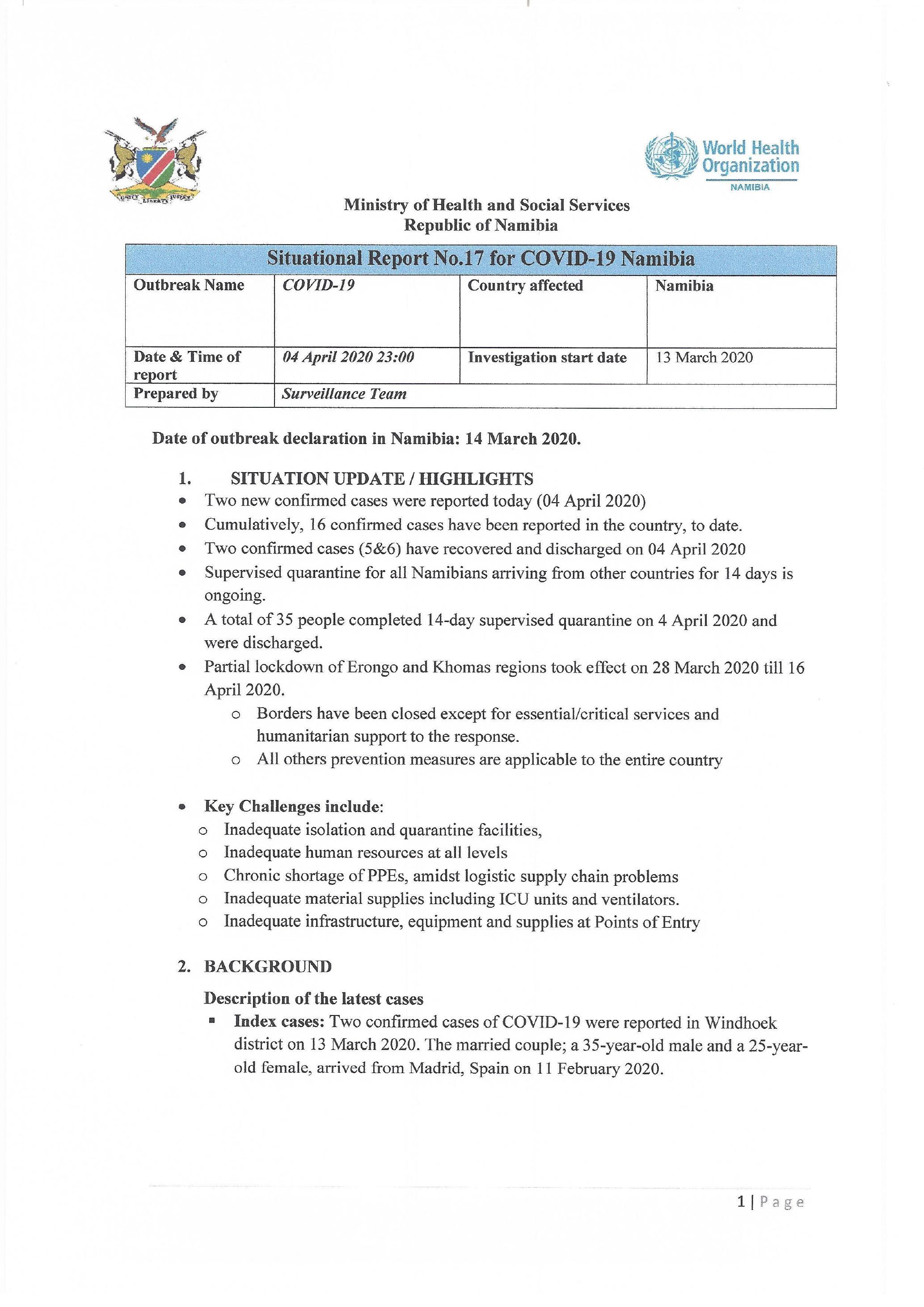 = Index cases: Two confirmed cases of COVID-19 were reported in Windhoek