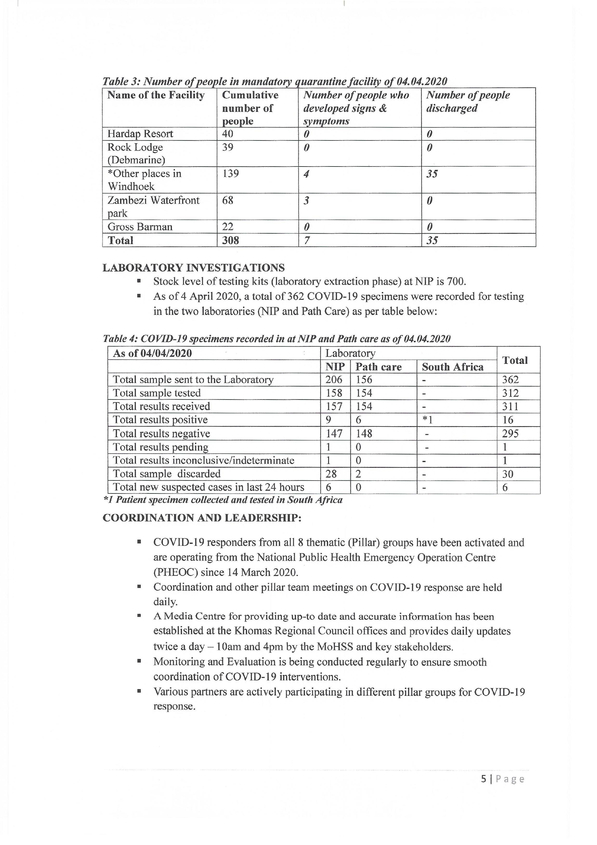 As of 4 April 2020, a total of 362 COVID-19 specimens were recorded for testing