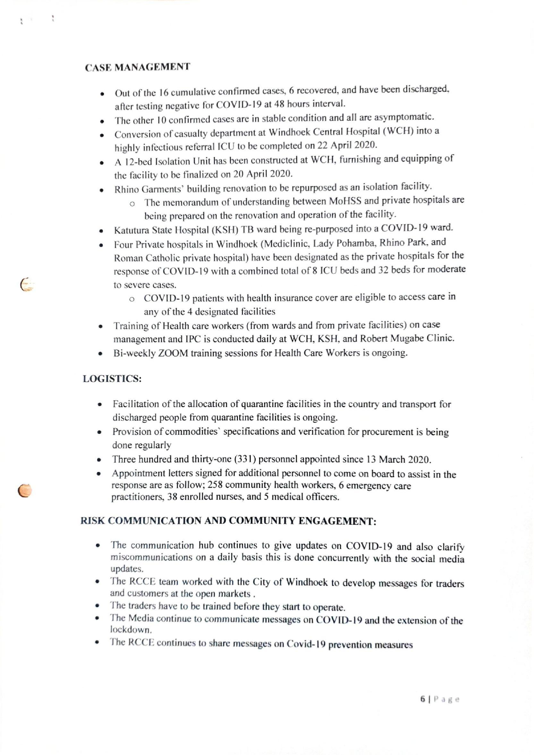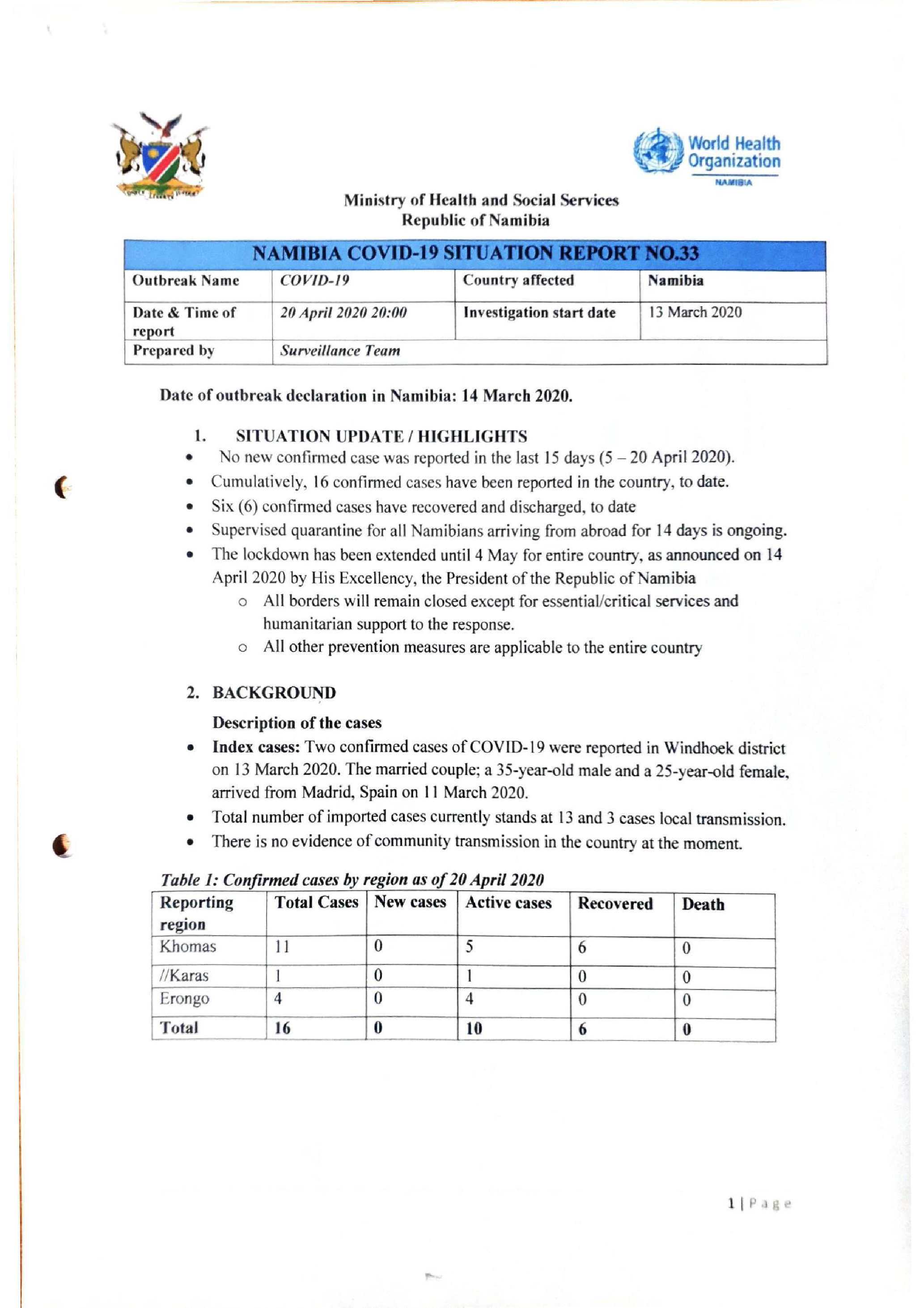 e Index cases: Two confirmed cases of COVID-19 were reported in Windhoek district