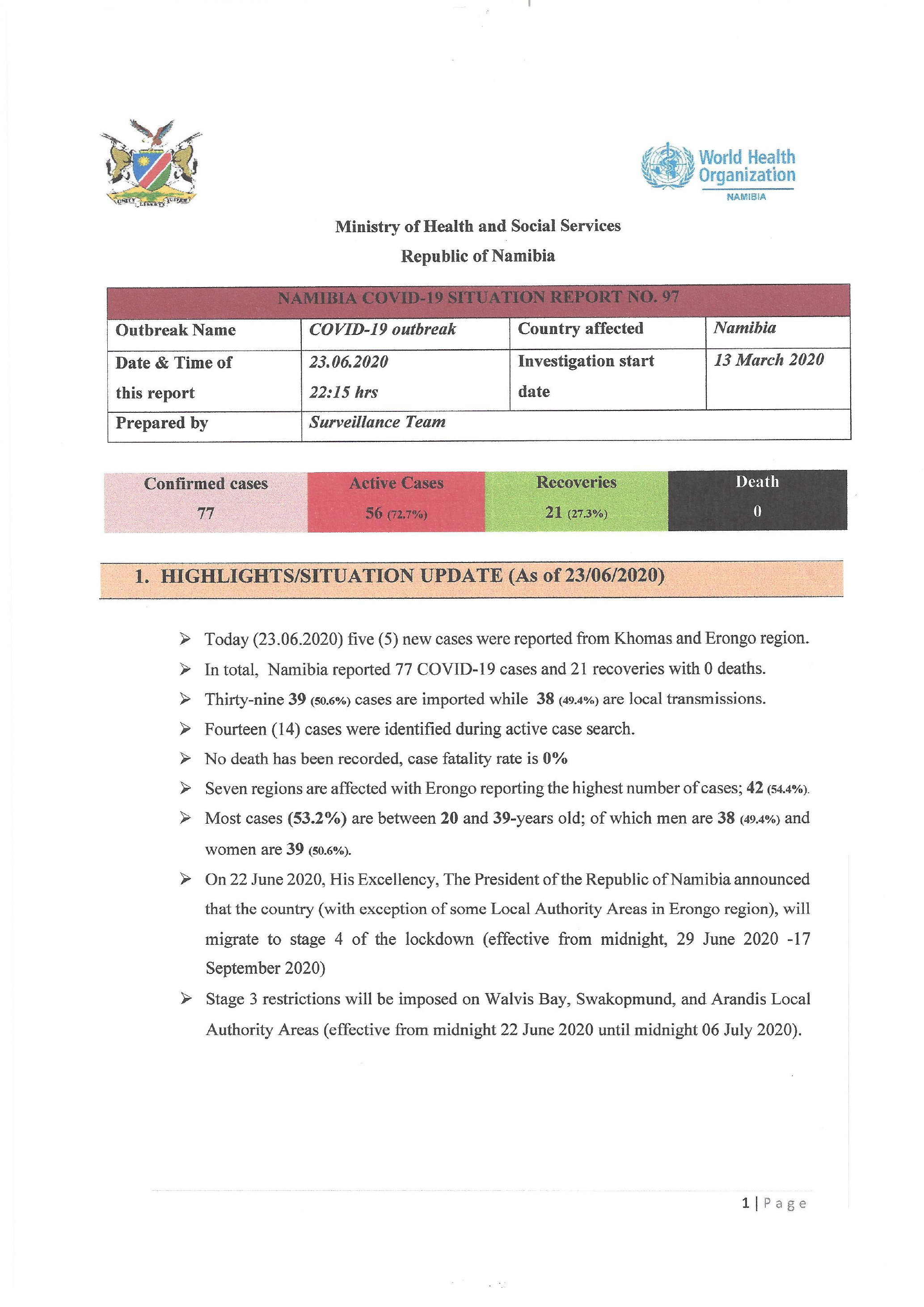 Since 14 March 2020, when the COVID-19 outbreak was declared in Namibia, a total of 77