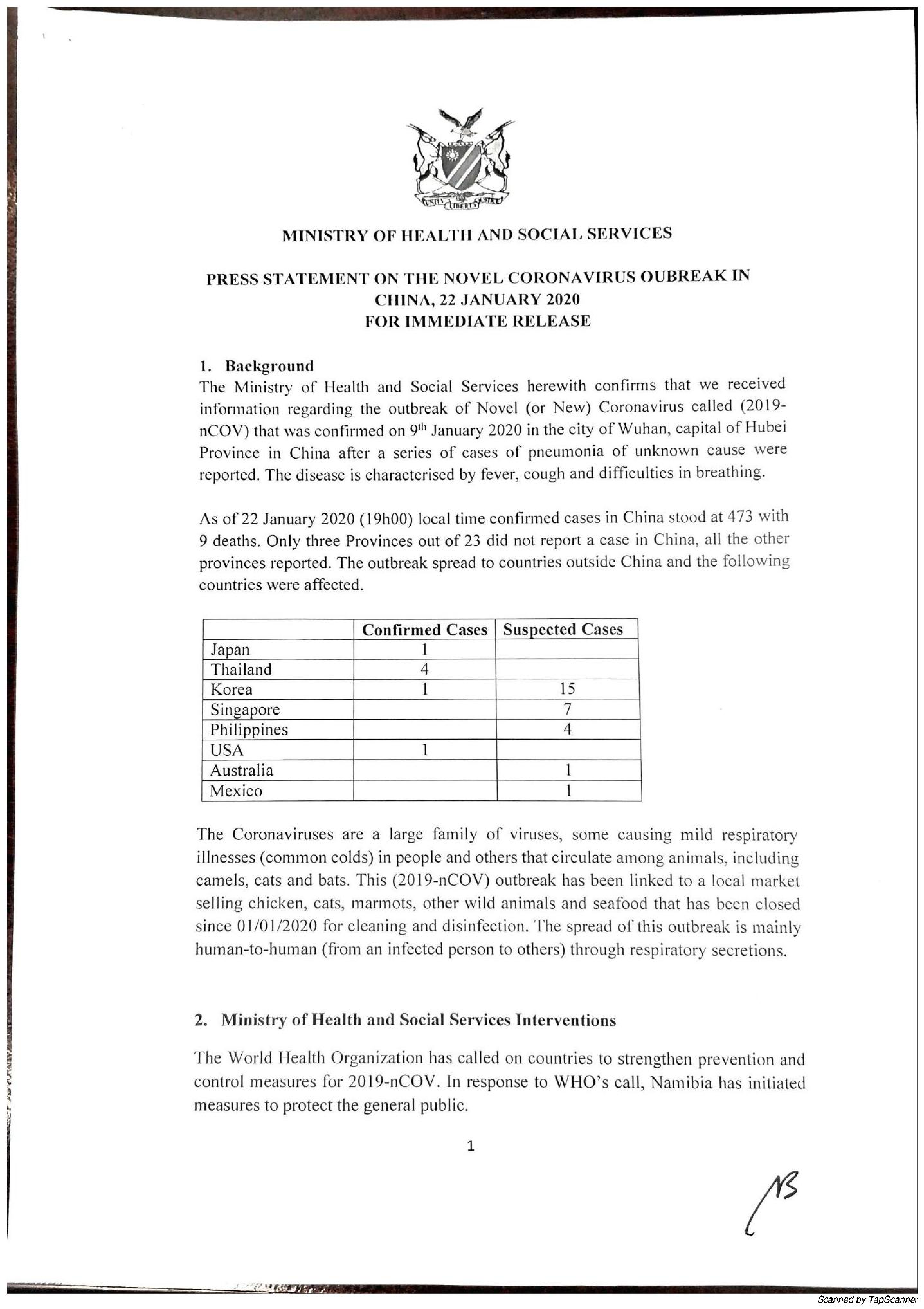 PRESS STATEMENT ON THE NOVEL CORONAVIRUS OUBREAK IN