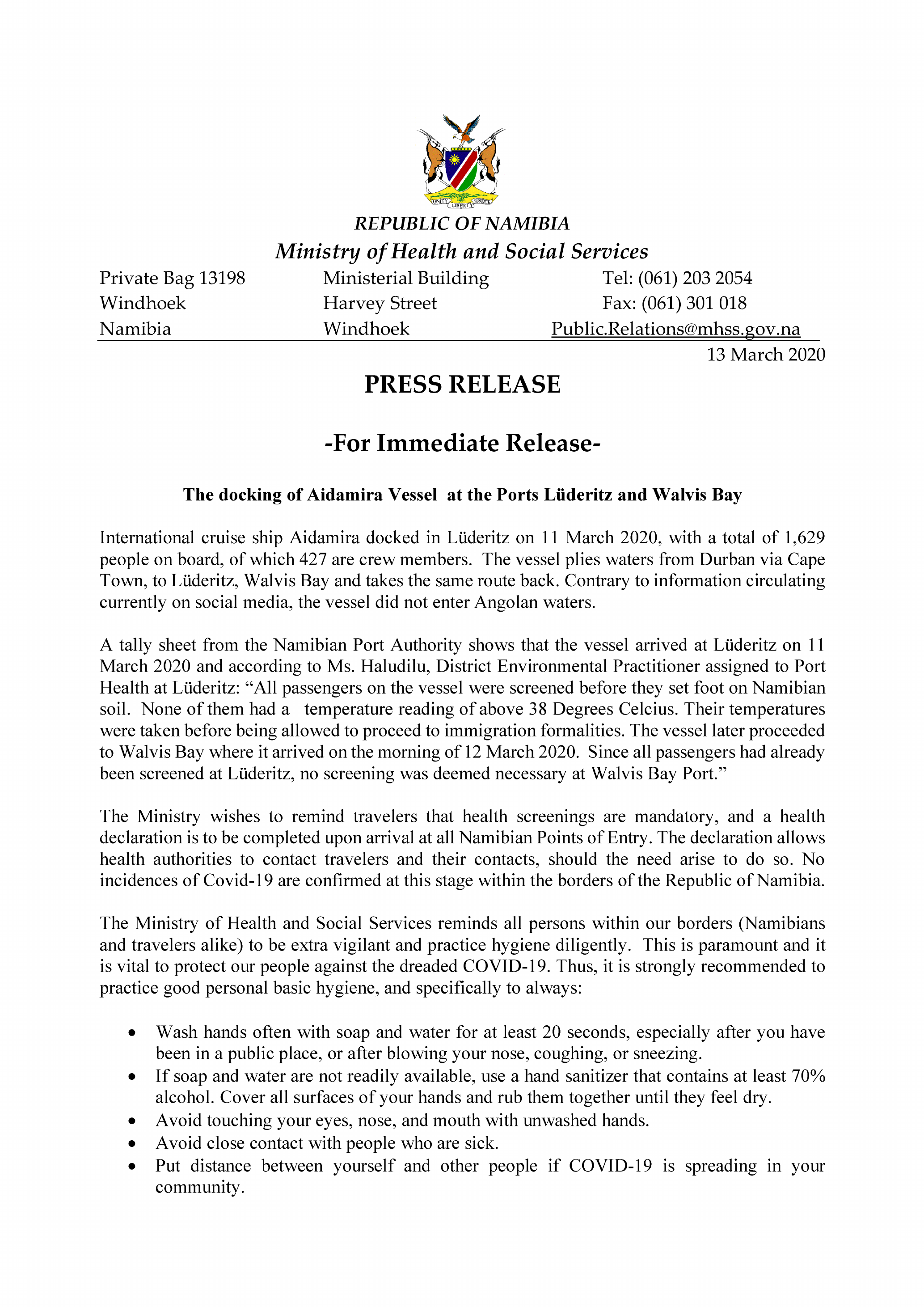 to Walvis Bay where it arrived on the morning of 12 March 2020. Since all passengers had already