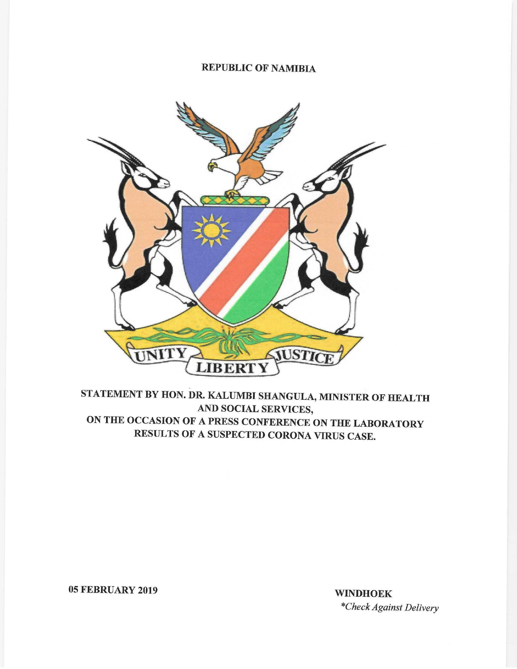 STATEMENT BY HON. DR. KALUMBI SHANGULA, MINISTER OF HEALTH