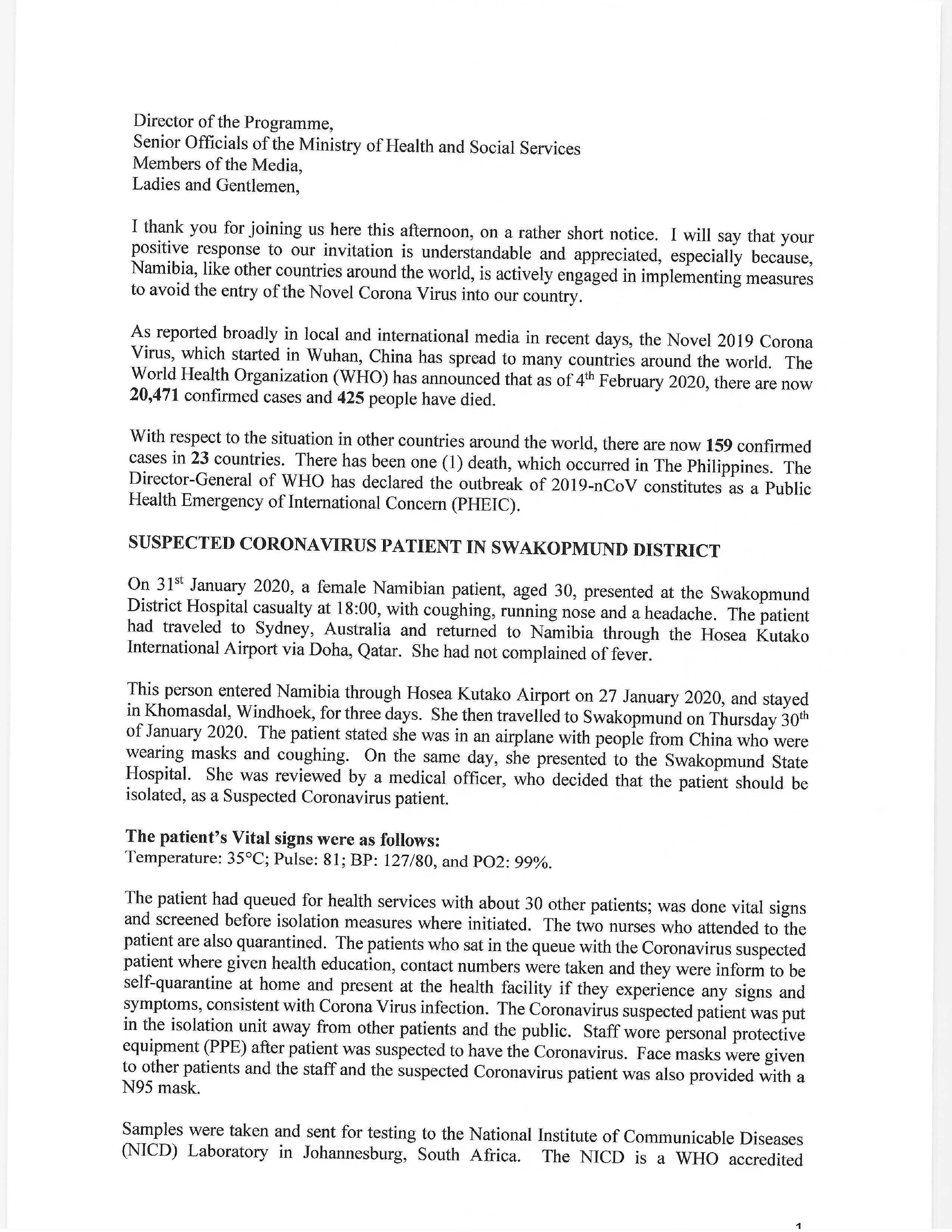 SUSPECTED CORONAVIRUS PATIENT IN SWAKOPMUND DISTRICT