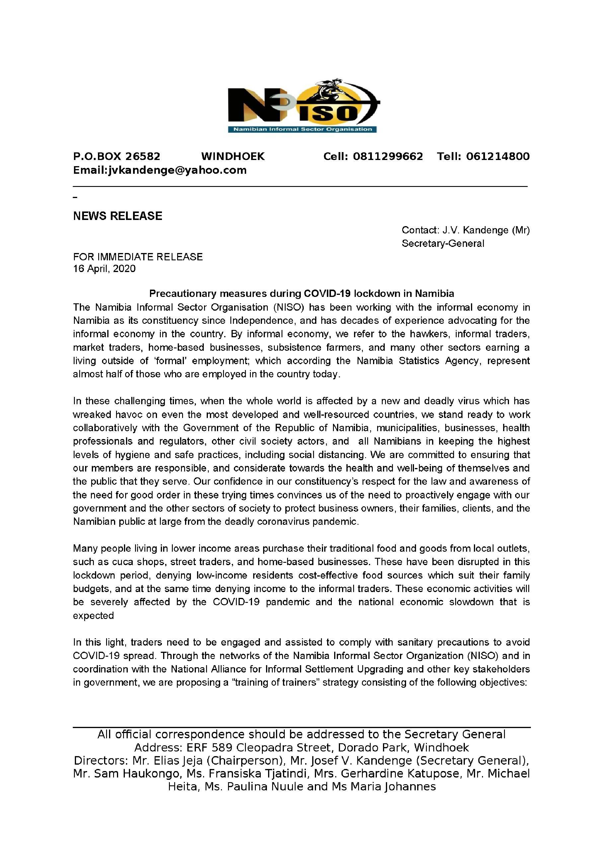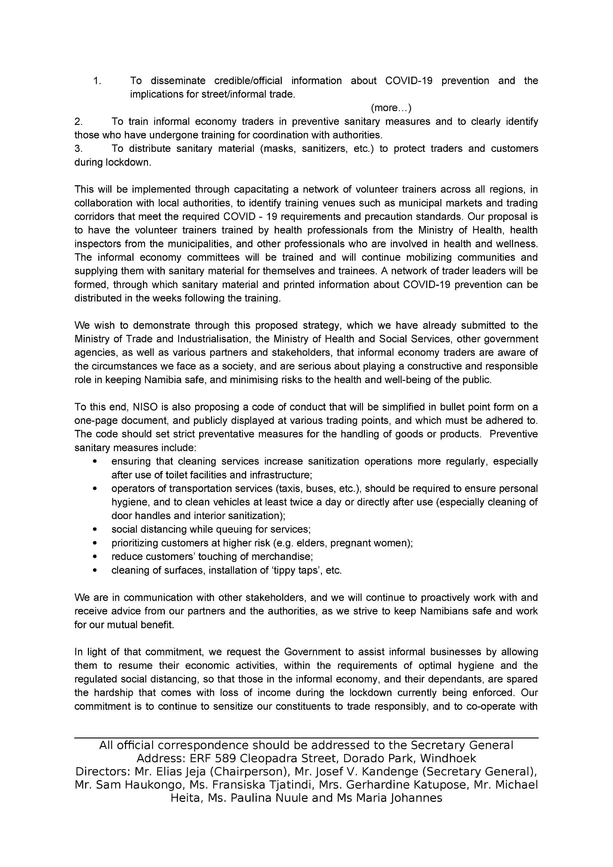 COVID-19 spread. Through the networks of the Namibia Informal Sector Organization (NISO) and in