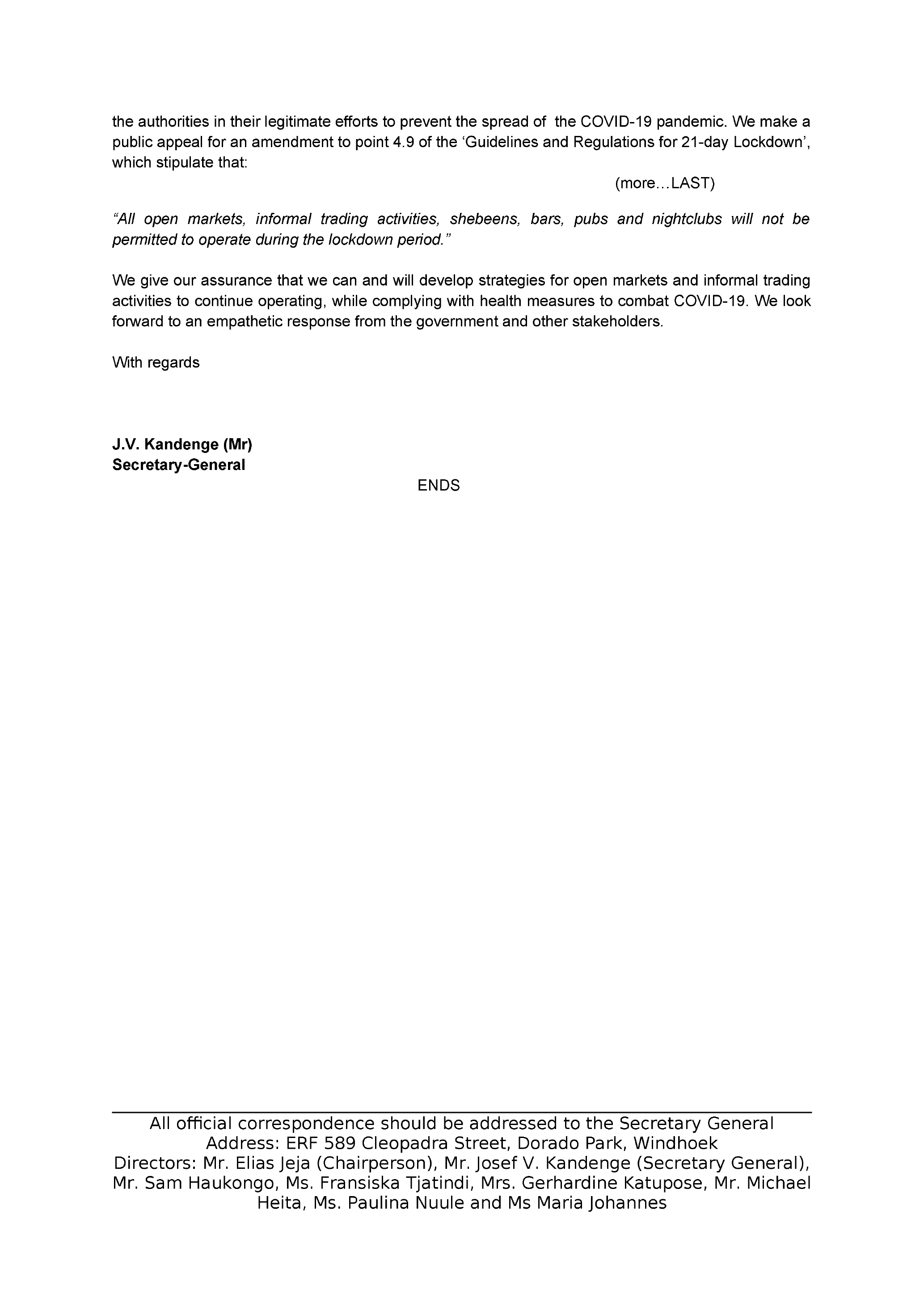 Directors: Mr. Elias Jeja (Chairperson), Mr. Josef V. Kandenge (Secretary General),