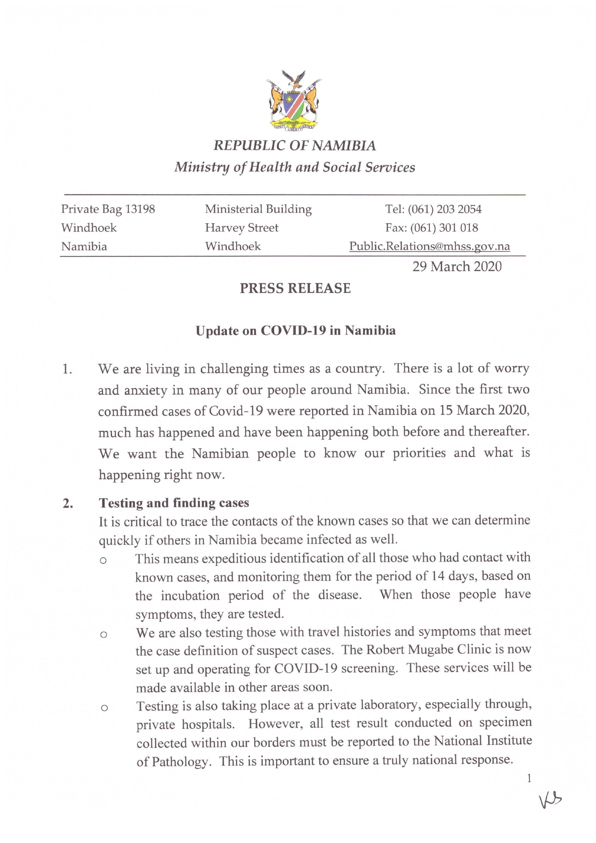 2020 in Namibia. She visited a health facility on the 26" March 2020.