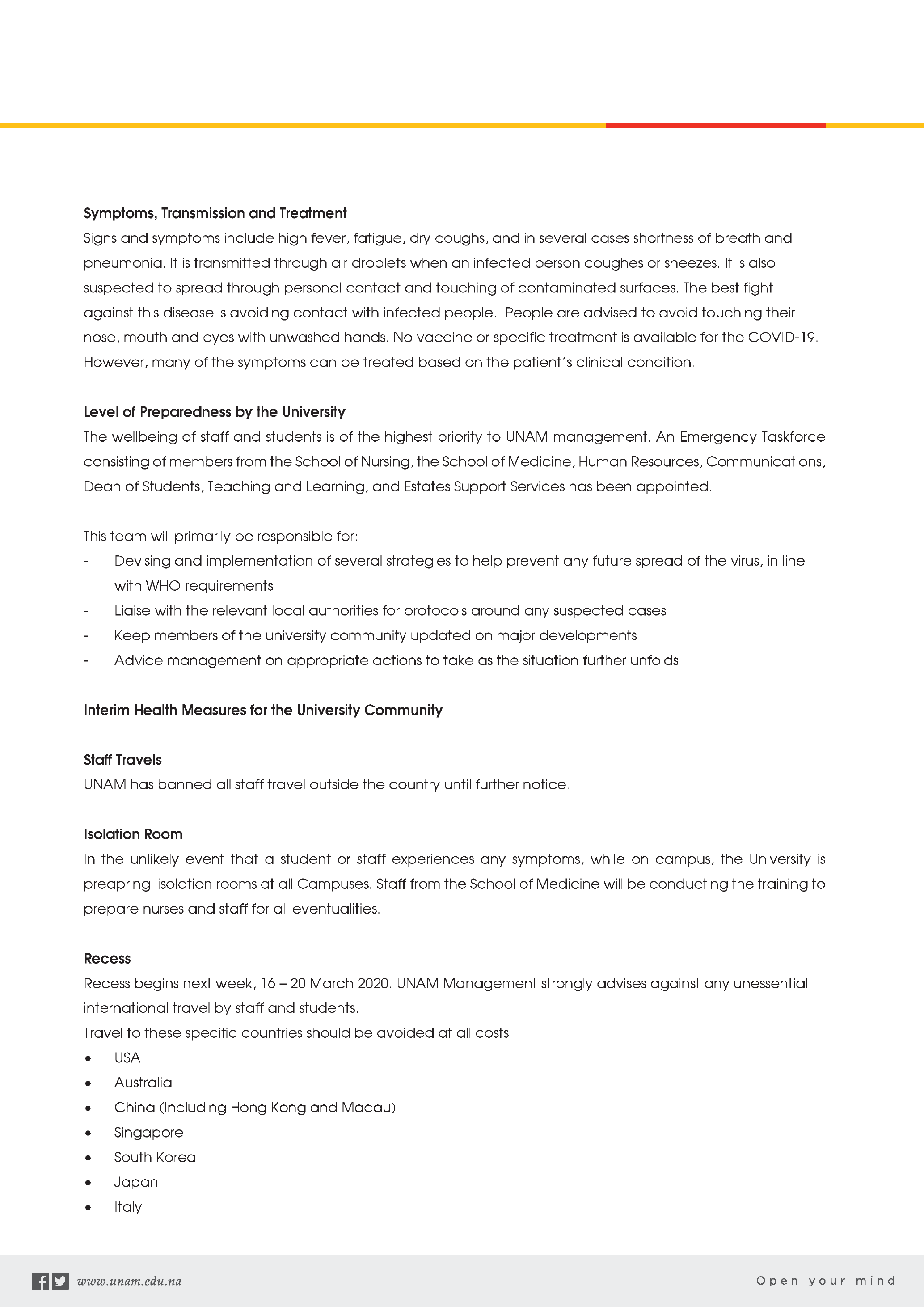 Recess begins next week, 16 — 20 March 2020, UNAM Management strongly advises against any unessential